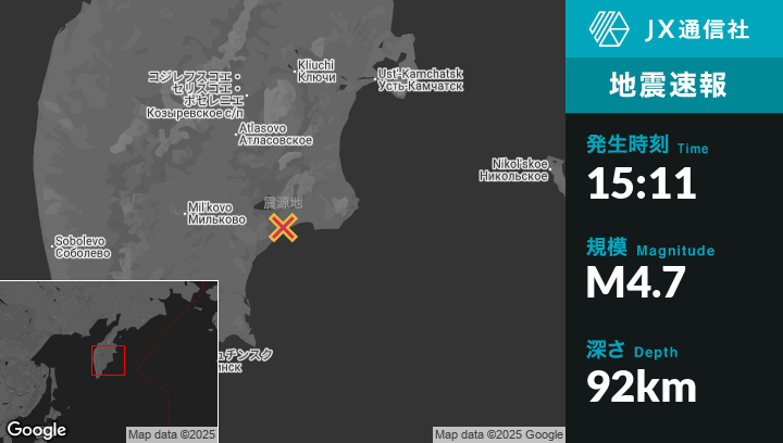 7月05日 15:11頃、ロシアのMil’kovoから東127kmの地点でM4.7の地震がありました。