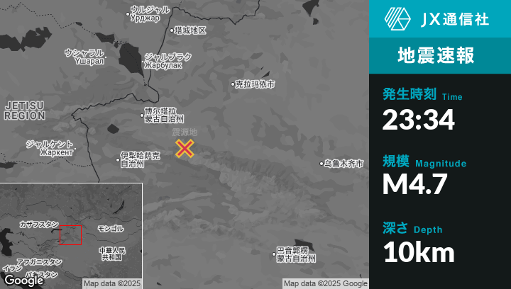 7月06日 23:34頃、中国のXinyuanから北93kmの地点でM4.7の地震がありました。