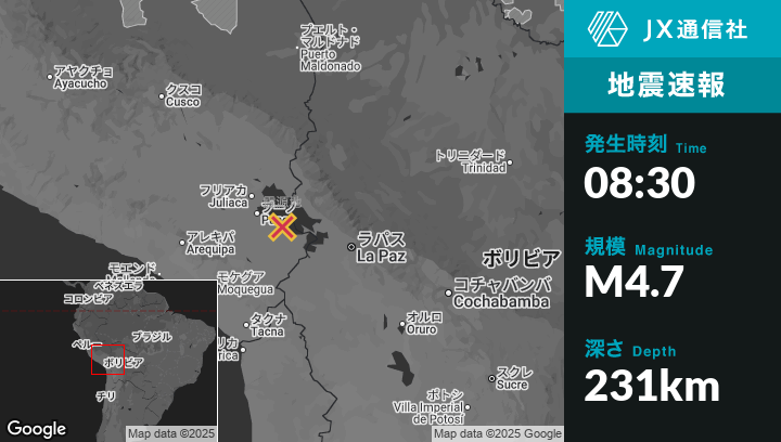 7月08日 08:30頃、ペルーのPilcuyoから北北東14kmの地点でM4.7の地震がありました。