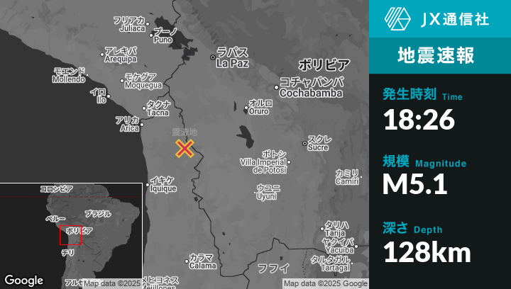 7月10日 18:26頃、チリのColchaneから西北西43kmの地点でM5.1の地震がありました。