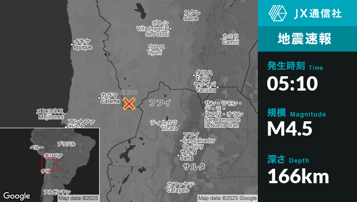 | 震源地 | チリのSan Pedro de Atacamaから東北東72kmの地点 |