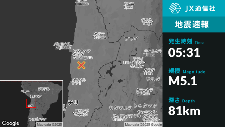 | 震源地 | チリのAntofagastaから南東92kmの地点 |