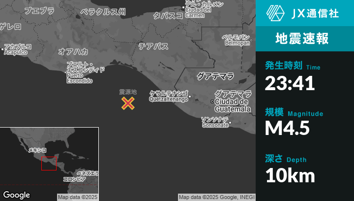 | 震源地 | メキシコのManuel Ávila Camacho (Ponte Duro)から南南西146kmの地点 |
