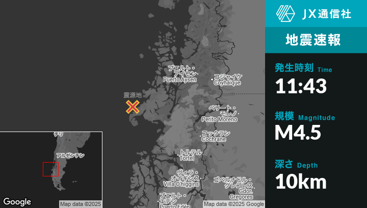 7月20日 11:43頃、チリのPuerto Chacabucoから西南西227kmの地点でM4.5の地震がありました。