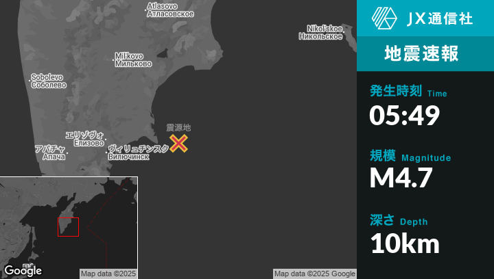 | 震源地 | ロシアのPetropavlovsk-Kamchatskyから東140kmの地点 |