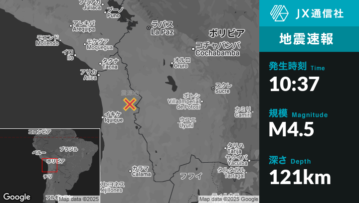 7月21日 10:37頃、チリのColchaneから南西47kmの地点でM4.5の地震がありました。