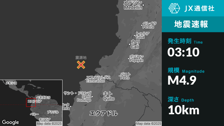 8月26日 03:10頃、エクアドルのEsmeraldasから北北西135kmの地点でM4.9の地震がありました。