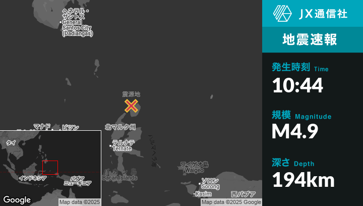 | 震源地 | インドネシアのTobeloから北北東104kmの地点 |