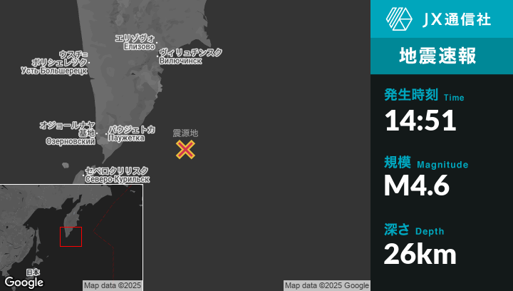 8月26日 14:51頃、ロシアのOzernovskiyから東194kmの地点でM4.6の地震がありました。