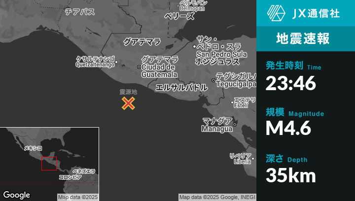 8月28日 23:46頃、グアテマラのPuerto San Joséから南南西85kmの地点でM4.6の地震がありました。