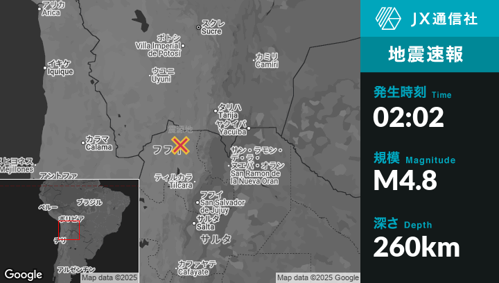 8月29日 02:02頃、アルゼンチンのAbra Pampaから北北西37kmの地点でM4.8の地震がありました。