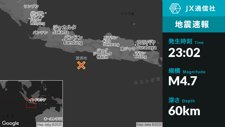 8月29日 23:02頃、インドネシアのCilacapから南92kmの地点でM4.7の地震がありました。