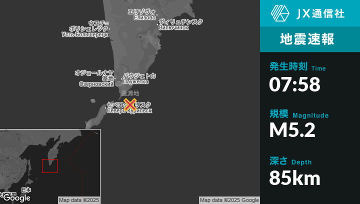 8月30日 07:58頃、ロシアのSevero-Kuril’skから東北東77kmの地点でM5.2の地震がありました。