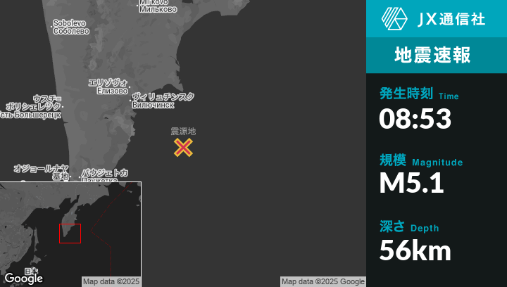 | 震源地 | ロシアのPetropavlovsk-Kamchatskyから南東142kmの地点 |