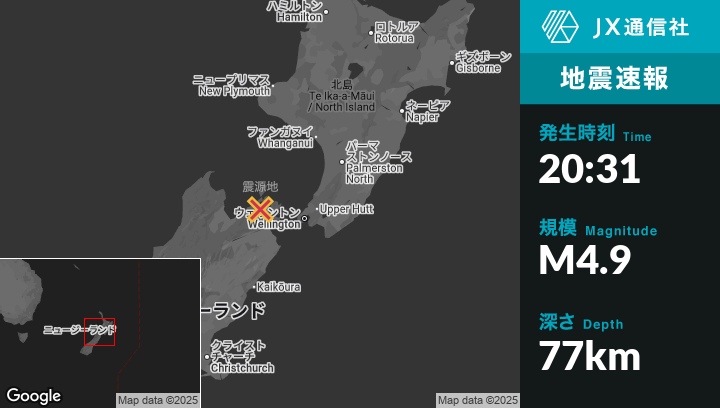 8月30日 20:31頃、ニュージーランドのWaikawaから北西32kmの地点でM4.9の地震がありました。