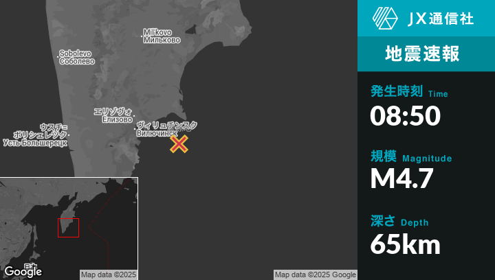 8月31日 08:50頃、ロシアのPetropavlovsk-Kamchatskyから東南東88kmの地点でM4.7の地震がありました。