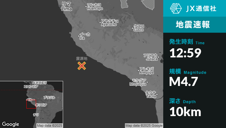 8月31日 12:59頃、ペルーのSan Juanから南南西76kmの地点でM4.7の地震がありました。