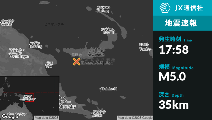 9月01日 17:58頃、パプアニューギニアのKandrianから南西29kmの地点でM5.0の地震がありました。