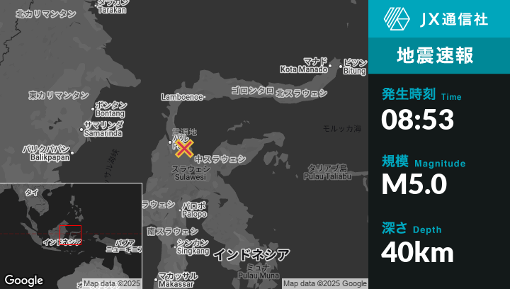9月03日 08:53頃、インドネシアのPaluから東51kmの地点でM5.0の地震がありました。