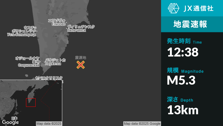 9月03日 12:38頃、ロシアのVilyuchinskから南南東180kmの地点でM5.3の地震がありました。