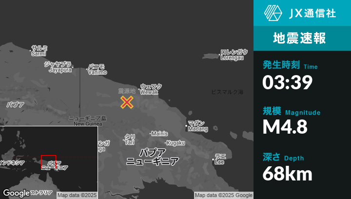 9月04日 03:39頃、パプアニューギニアのAmbuntiから東北東36kmの地点でM4.8の地震がありました。