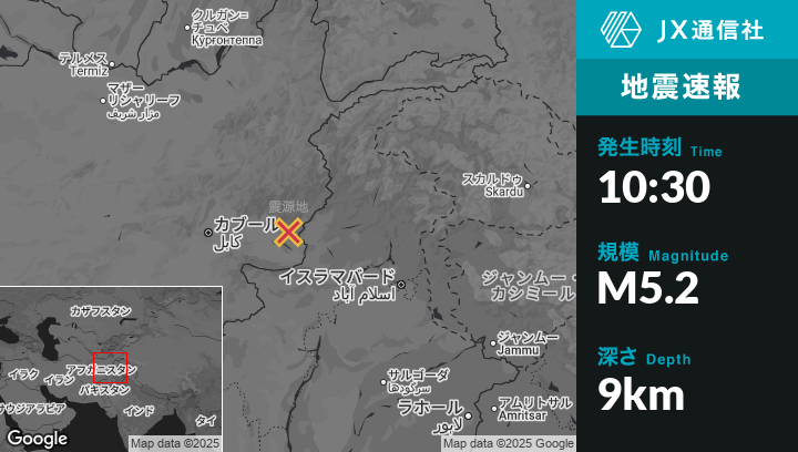9月05日 10:30頃、アフガニスタンのAsadābādから南西39kmの地点でM5.2の地震がありました。