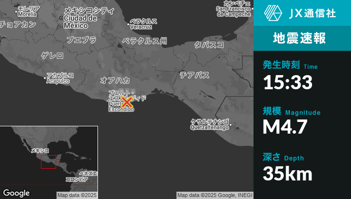 9月05日 15:33頃、メキシコのSan Miguel del Puertoから西北西2kmの地点でM4.7の地震がありました。