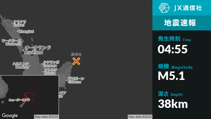9月07日 04:55頃、ニュージーランドのHicks Bayから東北東42kmの地点でM5.1の地震がありました。