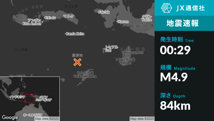 | 震源地 | インドネシアのTualから西南西238kmの地点 |