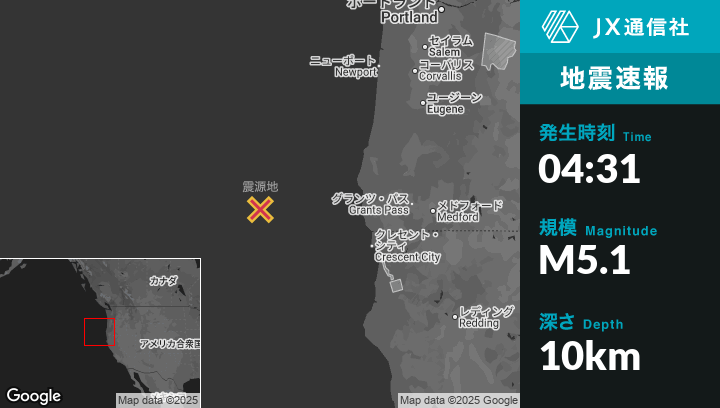 9月10日 04:31頃、オレゴンのPort Orfordから西南西181kmの地点でM5.1の地震がありました。