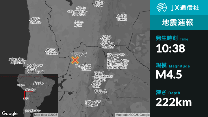 | 震源地 | アルゼンチンのAbra Pampaから西南西101kmの地点 |
