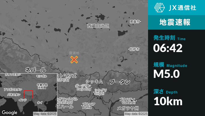 9月13日 06:42頃、ネパールのLobucheから北122kmの地点でM5.0の地震がありました。