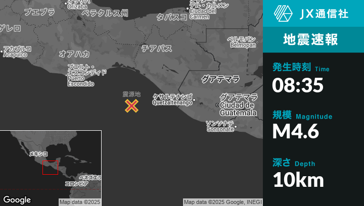 | 震源地 | メキシコのManuel Ávila Camacho (Ponte Duro)から南南西140kmの地点 |