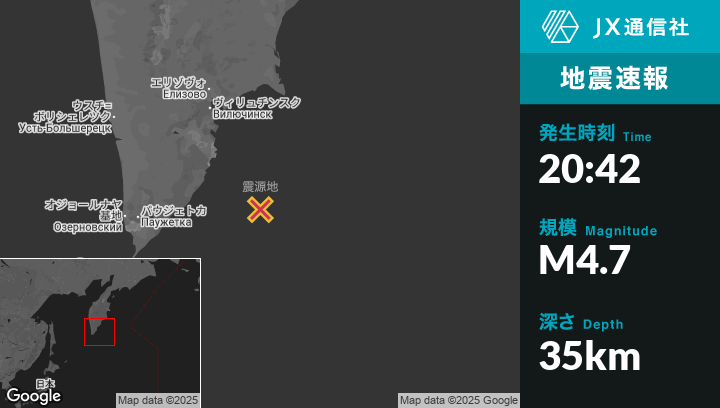 9月14日 20:42頃、ロシアのVilyuchinskから南南東161kmの地点でM4.7の地震がありました。