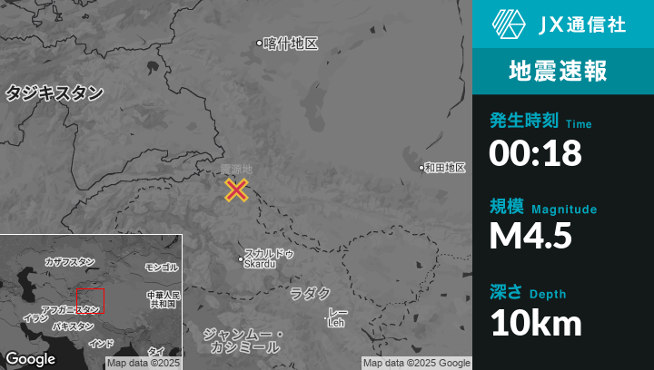 9月15日 00:18頃、パキスタンのBarishalから北東83kmの地点でM4.5の地震がありました。