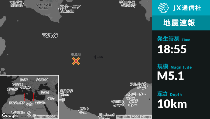 | 震源地 | マルタのBirżebbuġaから南東229kmの地点 |