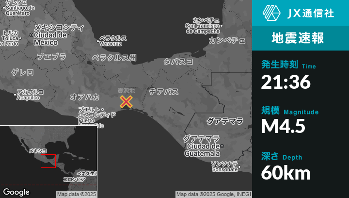 9月15日 21:36頃、メキシコのLázaro Cárdenasから南5kmの地点でM4.5の地震がありました。
