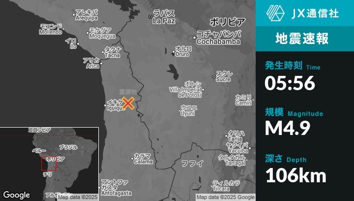 9月16日 05:56頃、チリのLa Tiranaから東北東63kmの地点でM4.9の地震がありました。