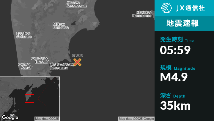 | 震源地 | ロシアのPetropavlovsk-Kamchatskyから東125kmの地点 |