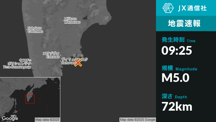 | 震源地 | ロシアのPetropavlovsk-Kamchatskyから東南東72kmの地点 |