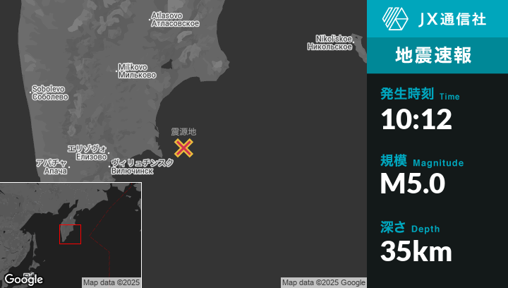 | 震源地 | ロシアのPetropavlovsk-Kamchatskyから東北東143kmの地点 |