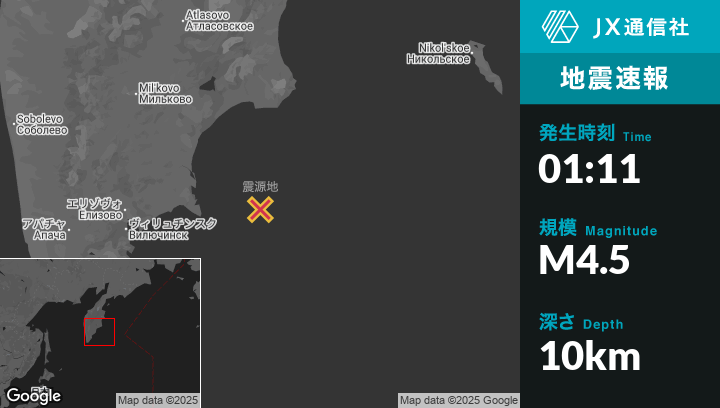 | 震源地 | ロシアのPetropavlovsk-Kamchatskyから東183kmの地点 |