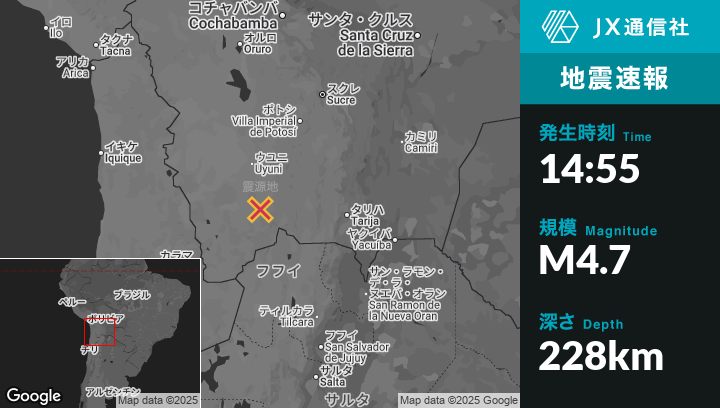 9月20日 14:55頃、ボリビアのAtochaから南西58kmの地点でM4.7の地震がありました。
