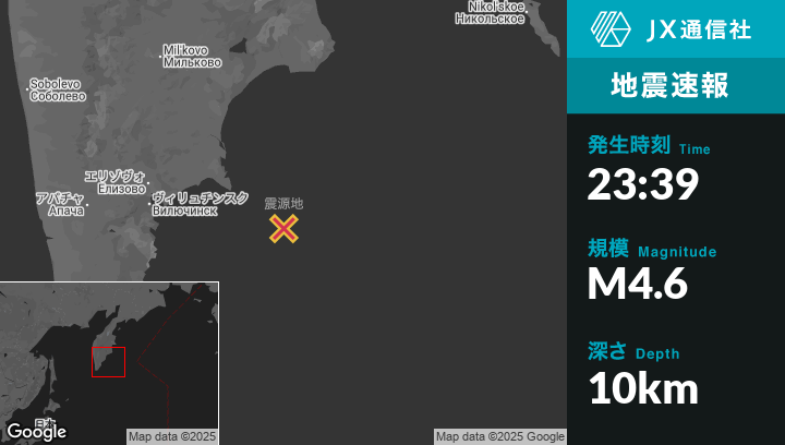 | 震源地 | ロシアのPetropavlovsk-Kamchatskyから東南東171kmの地点 |