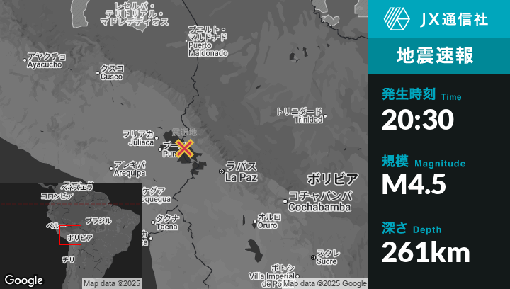 9月22日 20:30頃、ペルーのPutinaから南東27kmの地点でM4.5の地震がありました。
