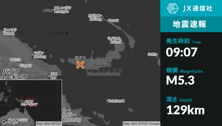 | 震源地 | パプアニューギニアのKandrianから北西59kmの地点 |