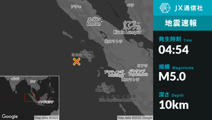 | 震源地 | インドネシアのGunungsitoliから南西111kmの地点 |