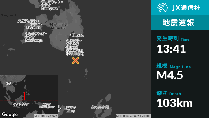 11月27日 13:41頃、フィリピンのSaranganiから東南東58kmの地点でM4.5の地震がありました。