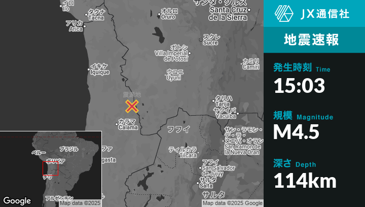 11月27日 15:03頃、チリのOllagüeから南43kmの地点でM4.5の地震がありました。