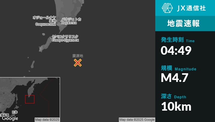 12月24日 04:49頃、ロシアのSevero-Kuril’skから南東182kmの地点でM4.7の地震がありました。